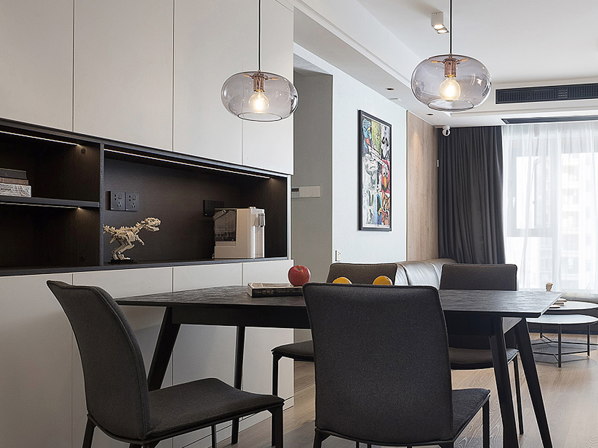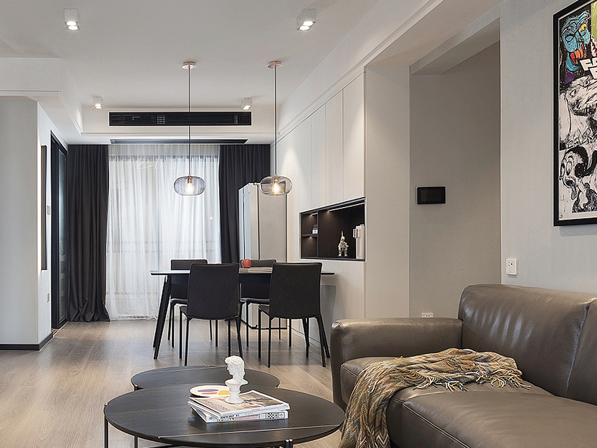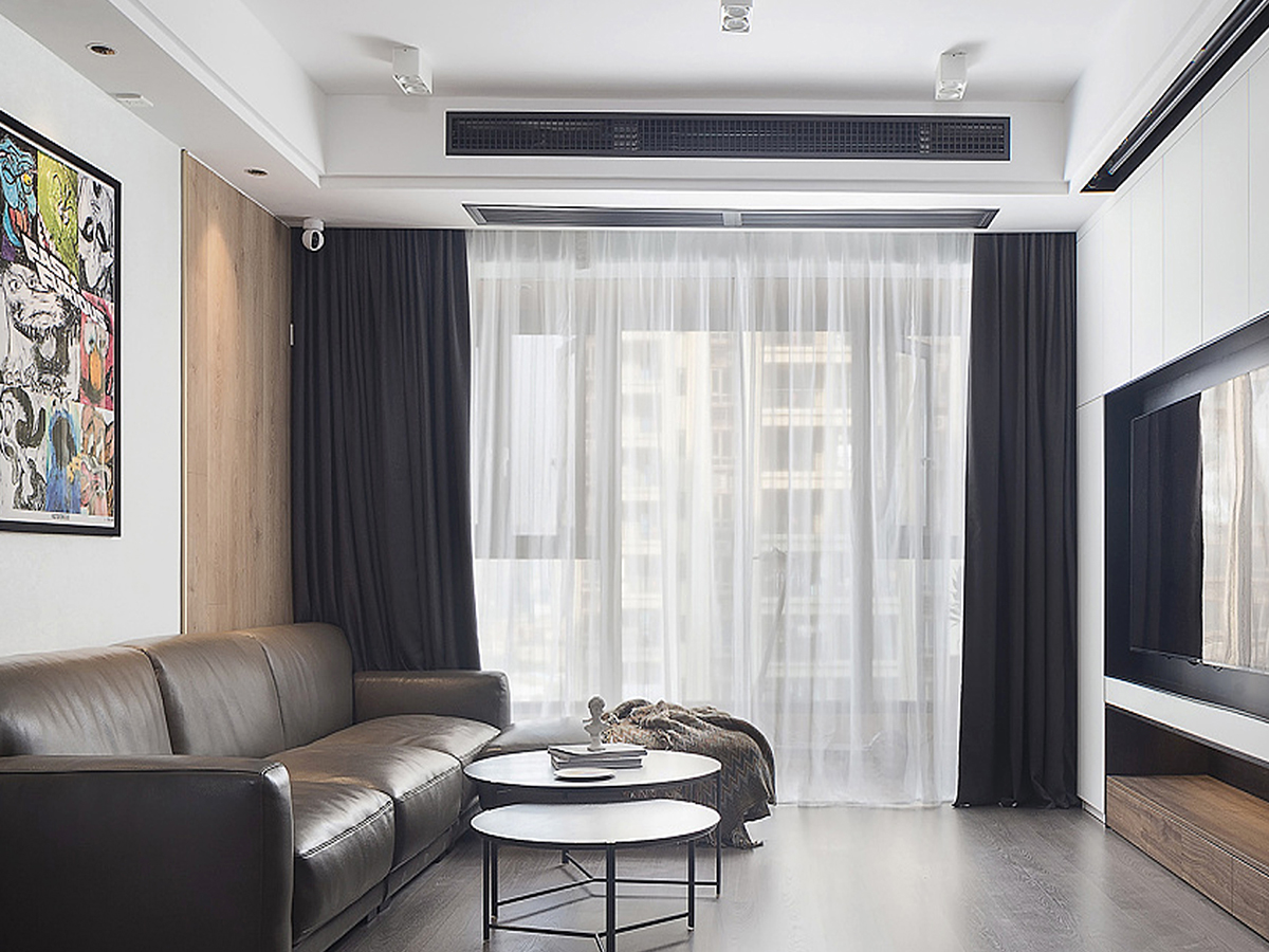 黑白基調、融入溫暖的木色,意在打造一個即冷靜又有點溫度的居室環境。