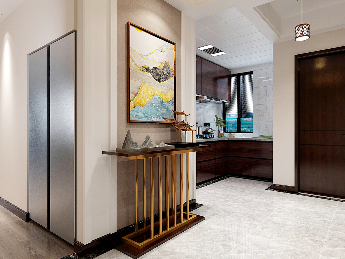 業主70后中年人,從業要求技術特別精湛的高級行業,家里原本家具都是純實木的簡約家具,質量都還特別好,業主考慮環保所以想現有的家具還都想再次裝修的時候都保留使用。設計師根據客戶的品味及家具的款式和顏色給業主推薦的是簡約美式風格。整體以暖色系為主,墻面的顏色也是圍繞著家具來配色,整體呼應出溫馨品質的居家氛圍。本戶型原本入戶之后直接是廚房,這樣給人進門的感覺有壓抑又覺得空間狹小,所以這次裝修考慮的是開放式廚房,同時又做了玄關裝飾,這樣一進門給人的感覺空間明亮又有裝飾亮點所在,給人心情愉悅的回家感覺。