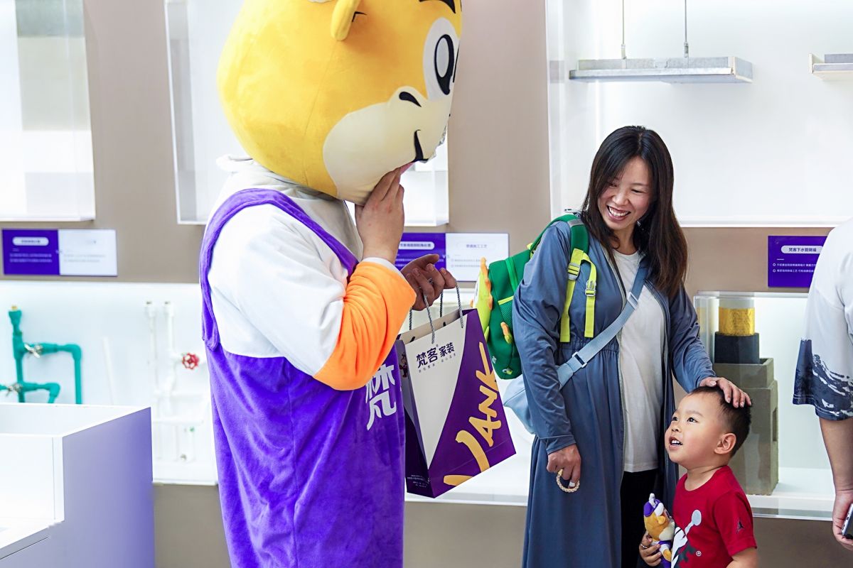 梵客吉祥物為小朋友送上伴手禮,對視微笑的眼神中充滿了信任…