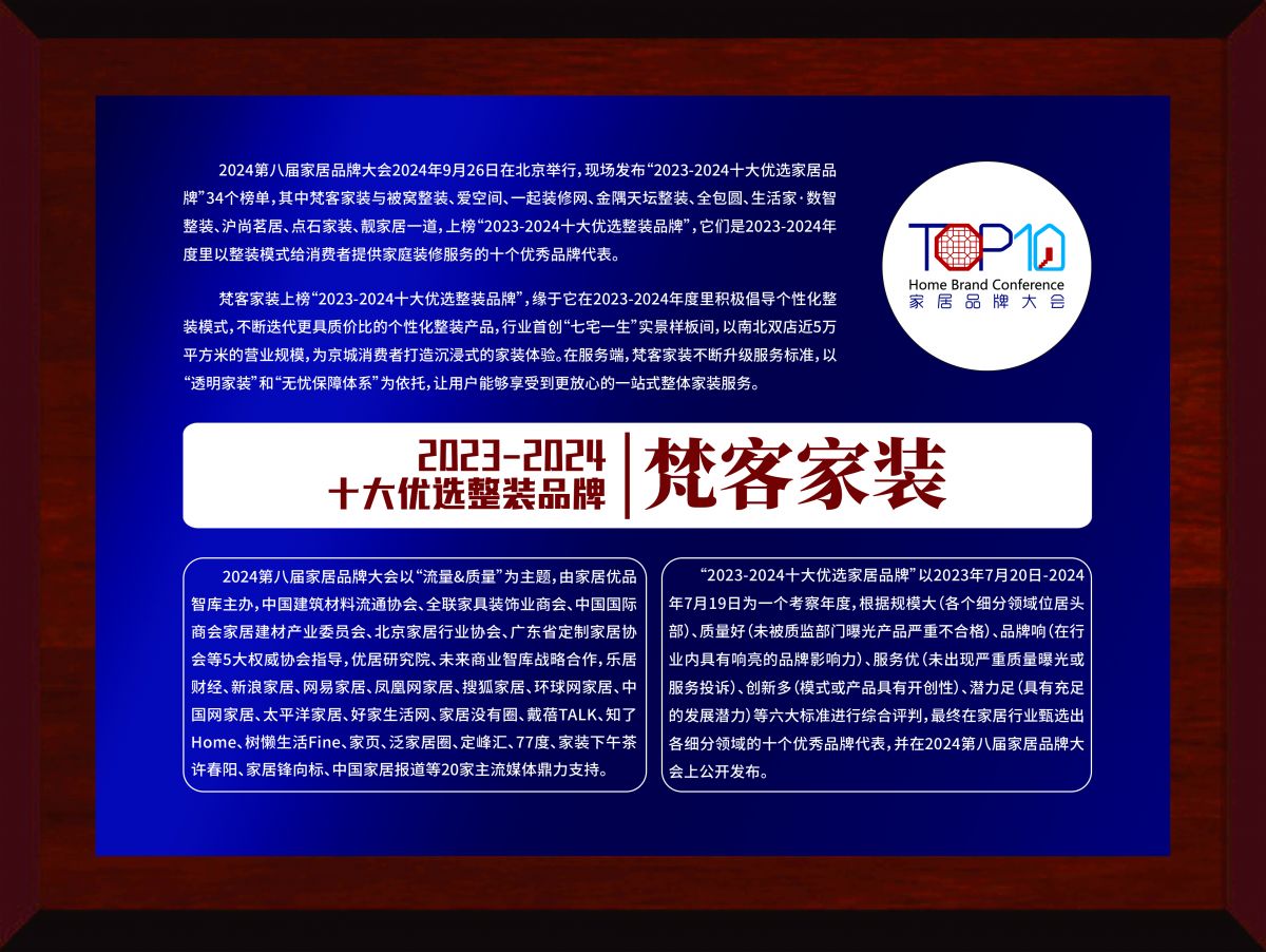 2024第八屆家居品牌大會在京舉行,現(xiàn)場發(fā)布“2023-2024十大優(yōu)選家居品牌”34個榜單,梵客家裝上榜“2023-2024十大優(yōu)選整裝品牌”。