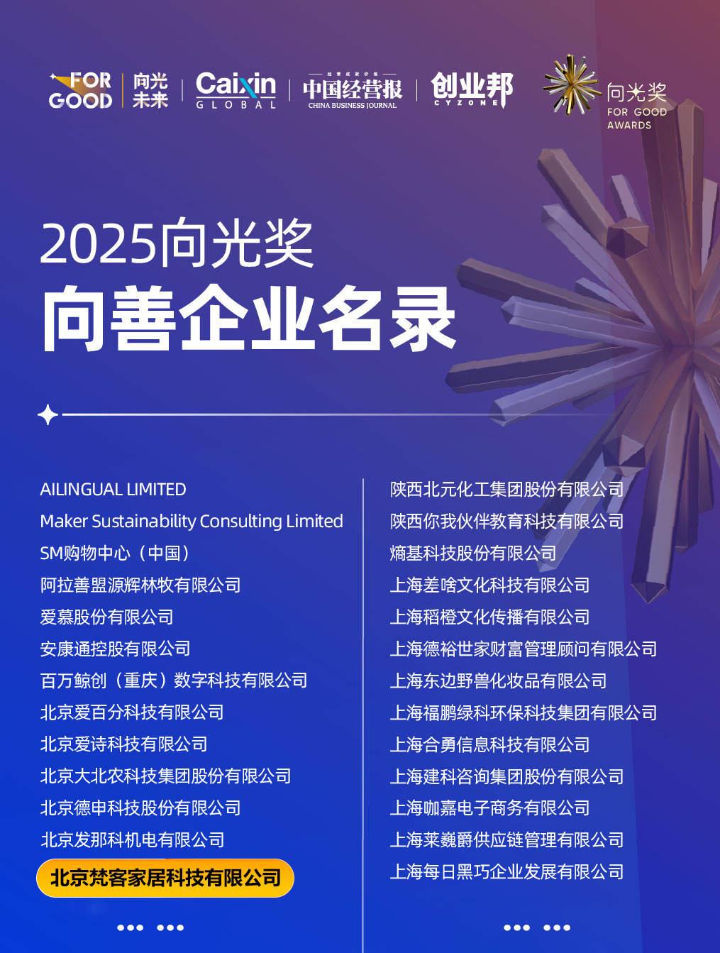 梵客家裝喜訊不斷,近日又?jǐn)孬@一項(xiàng)殊榮——入圍“2025向光獎(jiǎng)-向善企業(yè)名錄”!