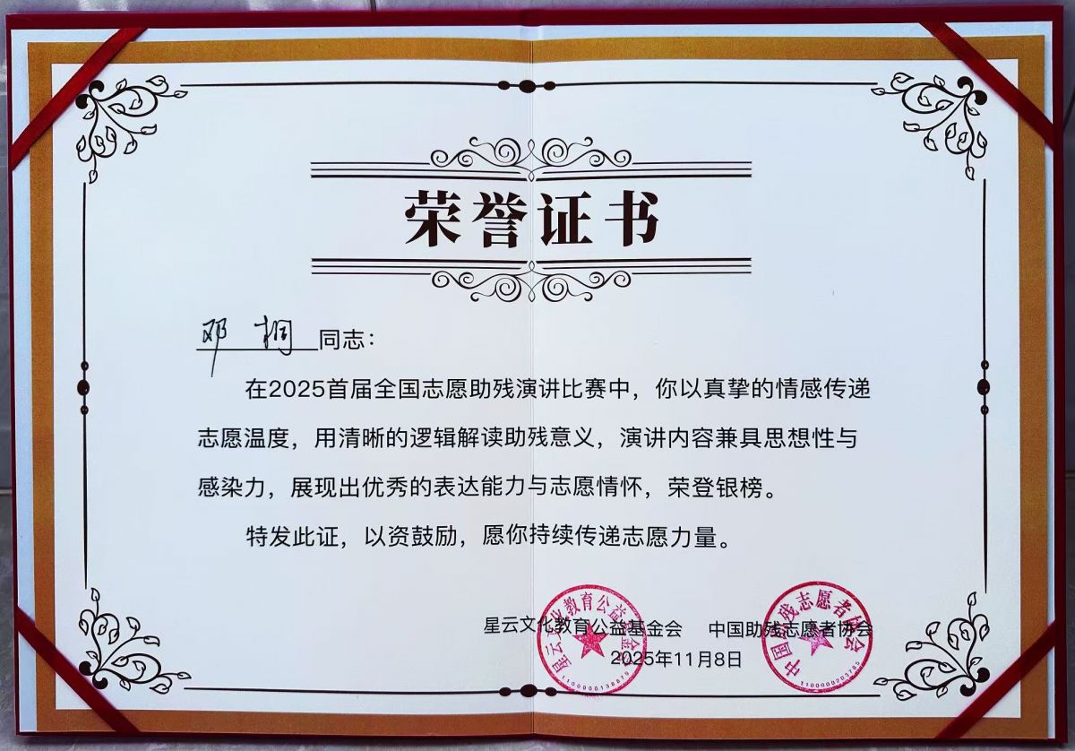 11月8日,由中國助殘志愿者協會與星云文化教育公益基金會聯合主辦的2025首屆全國志愿助殘演講比賽決賽在北京市規劃展覽館多功能廳隆重舉行,梵客集團社會事業部經理鄧桐斬獲殊榮。