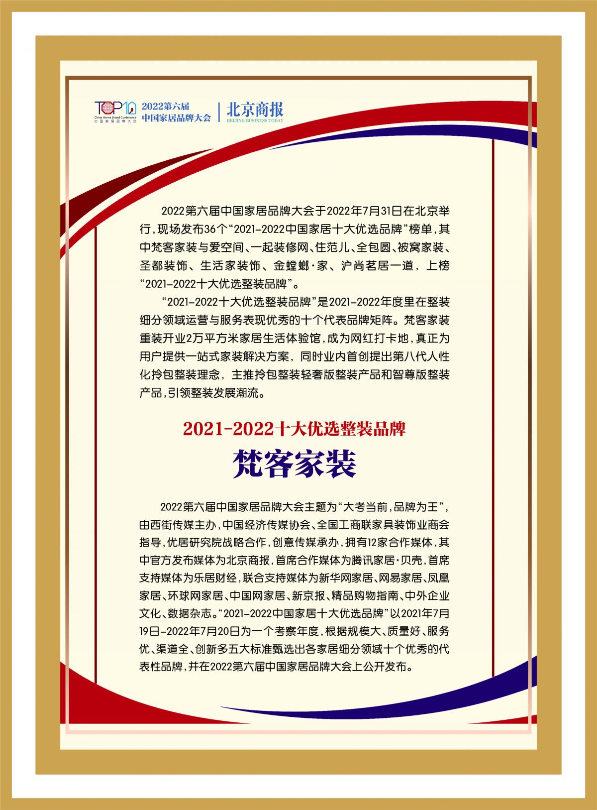 梵客家裝上榜2021-2022十大優選整裝品牌