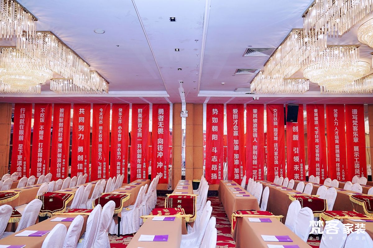 這是梵客家裝2023年首場(chǎng)大型會(huì)議,宴會(huì)廳現(xiàn)場(chǎng),被熱情洋溢的中國(guó)紅點(diǎn)亮,營(yíng)造出激勵(lì)人心的氛圍。以標(biāo)語裝點(diǎn)的背景墻,更是抒寫了每位梵客勇士的心聲: