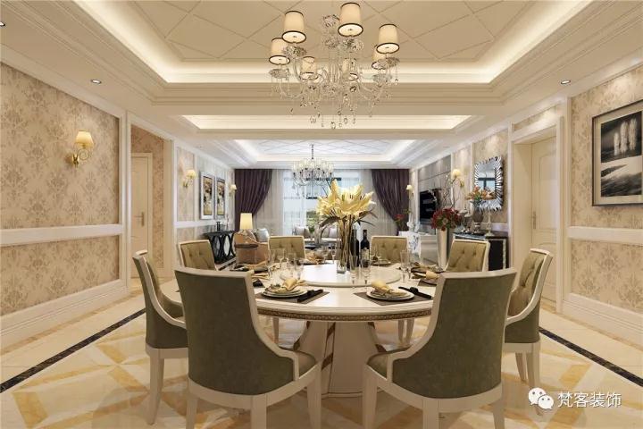 簡歐風格的空間主要以白色、淡色為主,以暖色調加以協調。家具則是白色或深色都可以,但要成系列,風格統一。客廳、餐廳、門廳過道是一個相連的空間,為了區分空間,在地面和頂面做了造型區分。