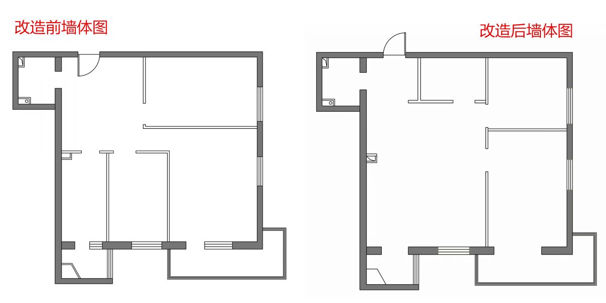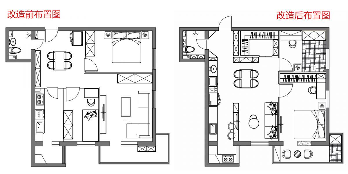 老戶型,有很多規劃不合理的地方,比如空間利用率不足、采光差、儲物空間欠缺等。設計師張曉紅重新進行布局,通過以下對比圖可看出: