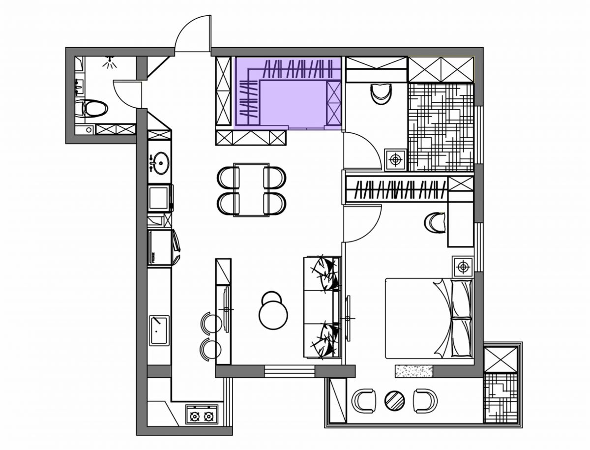 由餐邊柜旁邊的小門進去,便是擠出來的衣帽間。