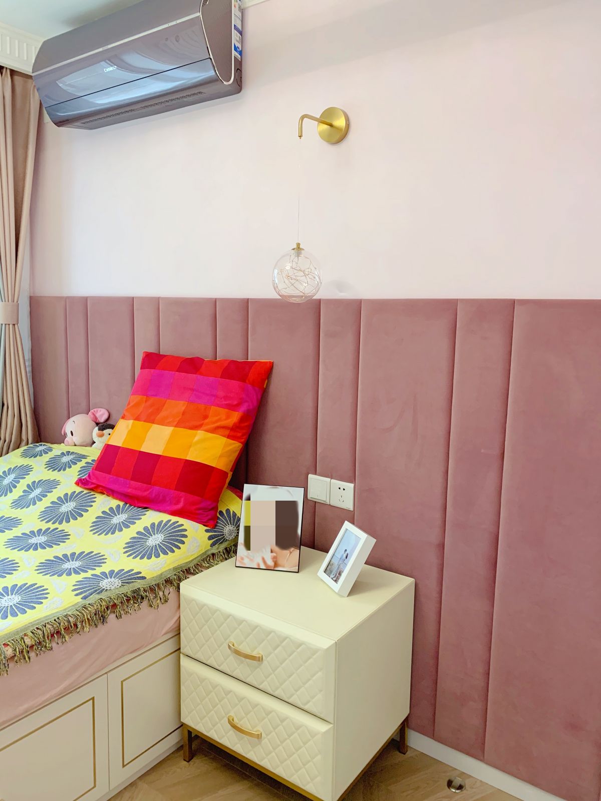 定制的軟包床頭,打底加軟包一共3公分,做的比一般墻體腰線高,軟硬厚度剛剛好,既不占用空間,靠著也舒服。豎條裝飾,還能拉高視覺空間。