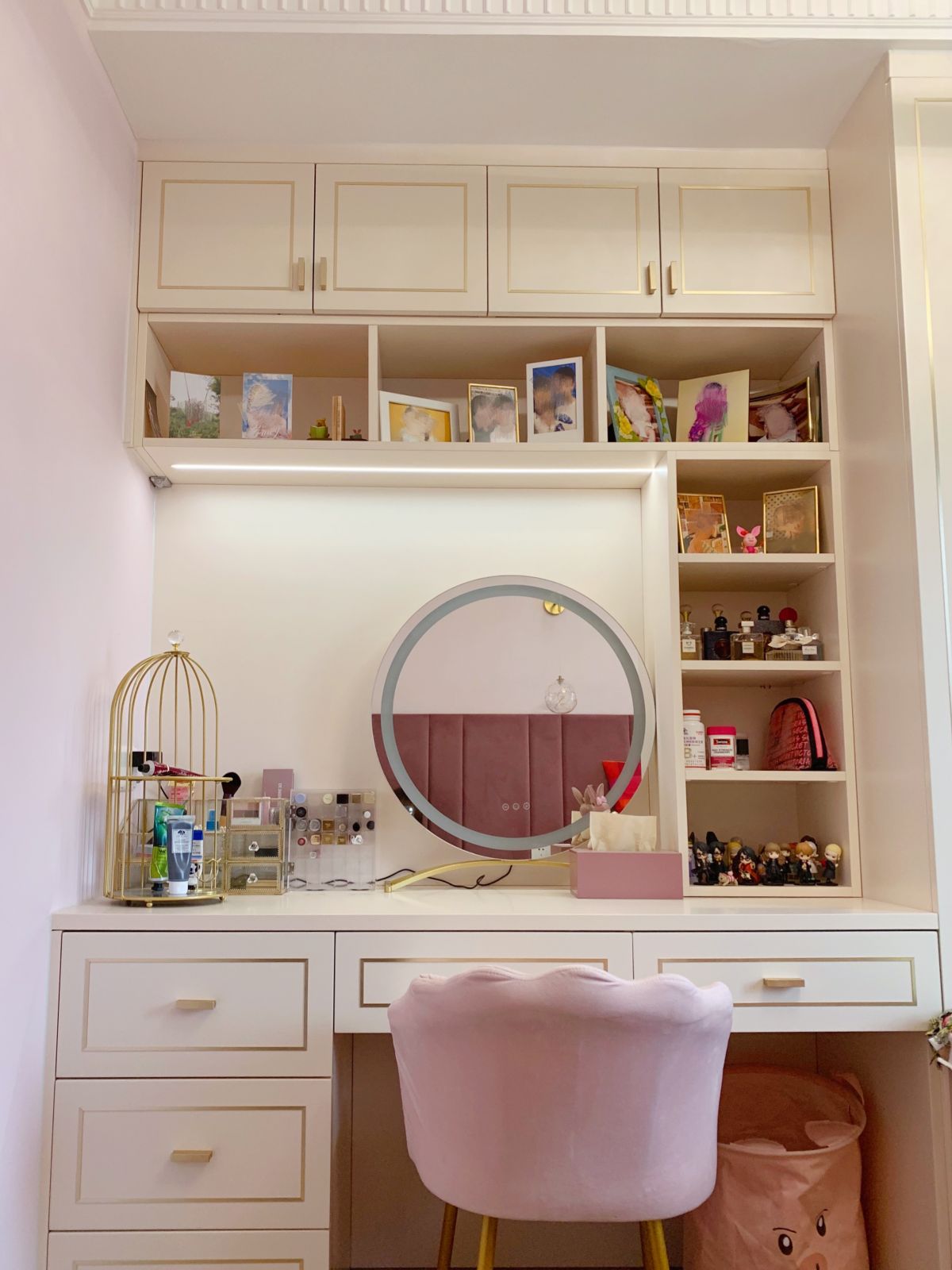 洗手盆設在廳處,更要講究顏值。量身定制,充分利用了每寸空間。米粉色的柜門,帶來浪漫的氣息。地漏做暗藏處理,保證美觀。