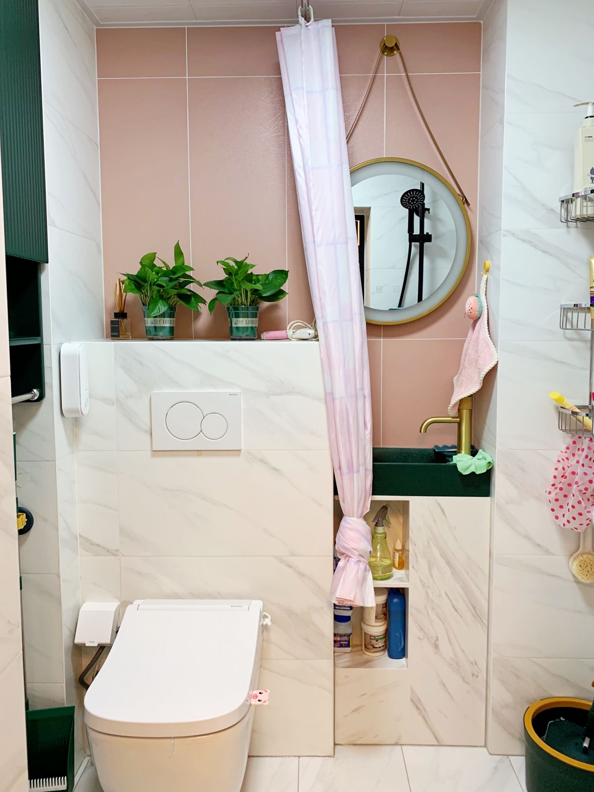 洗手間僅2.46平米,空間雖小,但每處設計都很講究。孔雀綠與櫻花粉的搭配,再加上黃銅元素的點綴,復古中融入了輕奢,簡直潮翻了。
