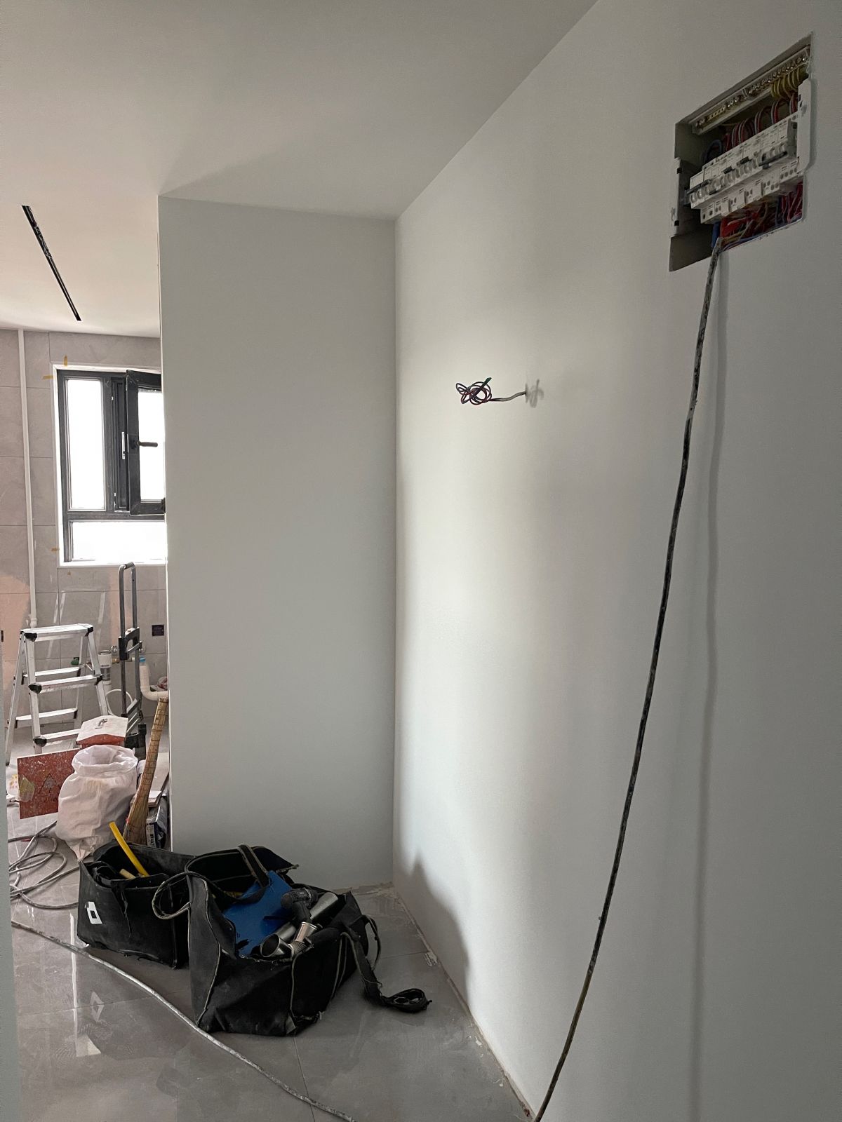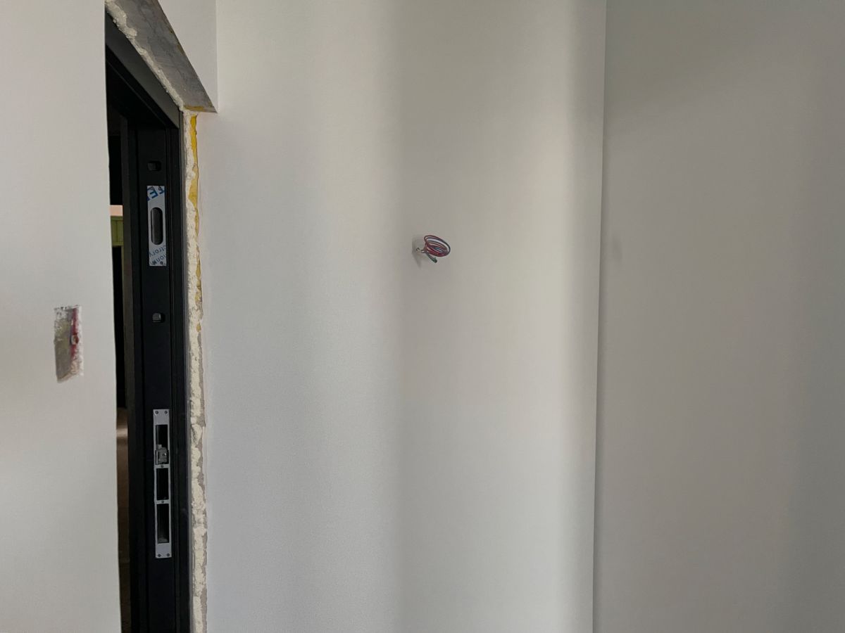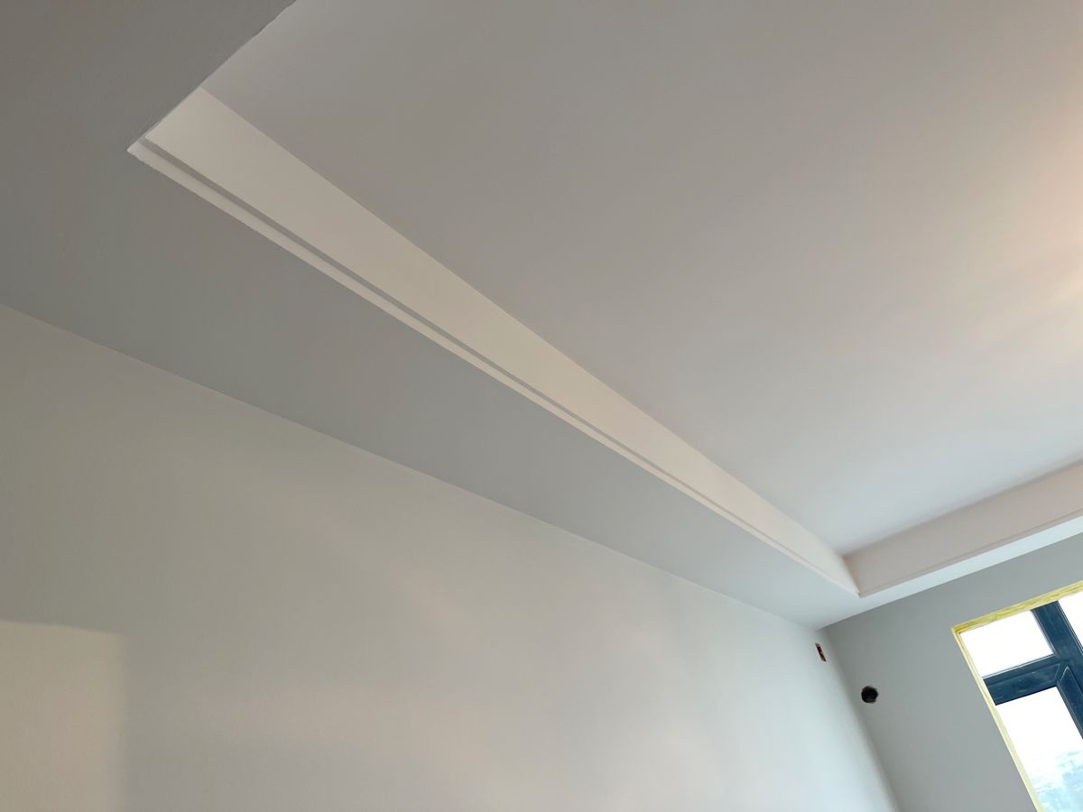 因為有貼墻的柜子,暫時未安裝踢腳線,同時為了配合柜子安裝,保證柜體與墻面緊密貼合、無縫隙,柜子從上到下嚴(yán)絲合縫,因此此處墻面做了垂平工藝。