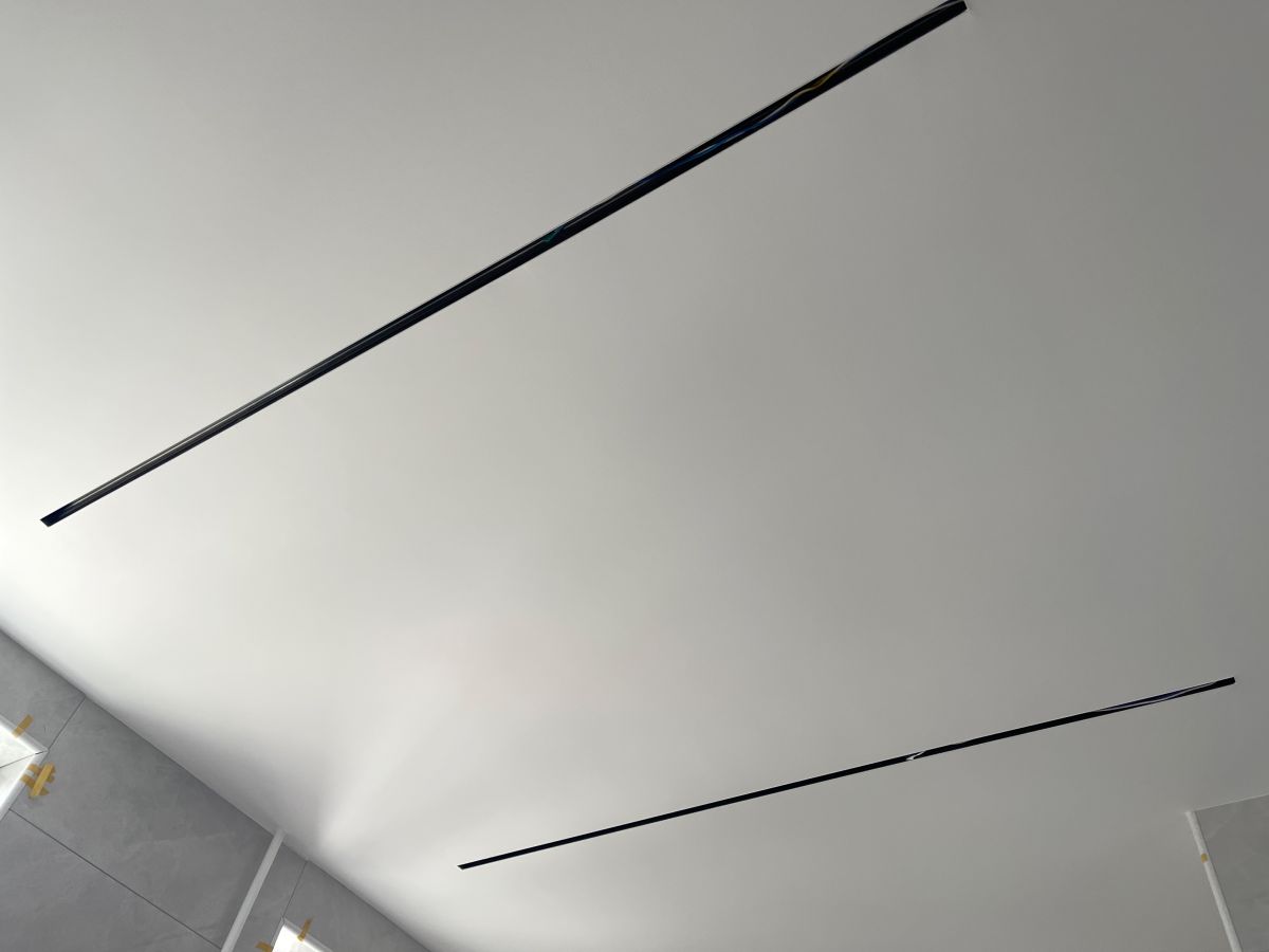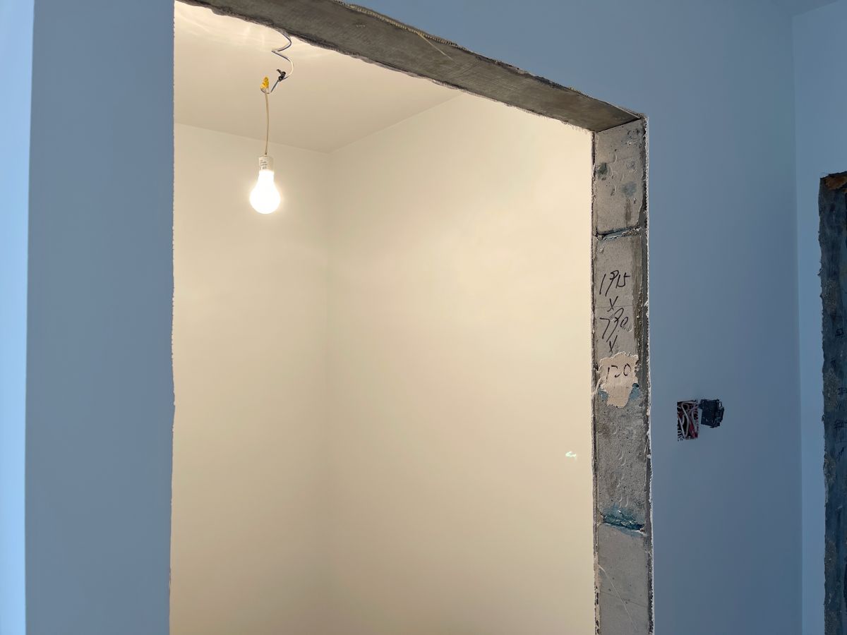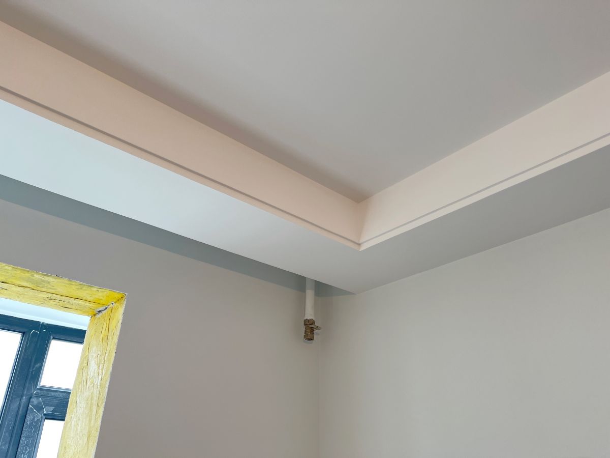 因為有貼墻的柜子,暫時未安裝踢腳線,同時為了配合柜子安裝,保證柜體與墻面緊密貼合、無縫隙,柜子從上到下嚴(yán)絲合縫,因此此處墻面做了垂平工藝。