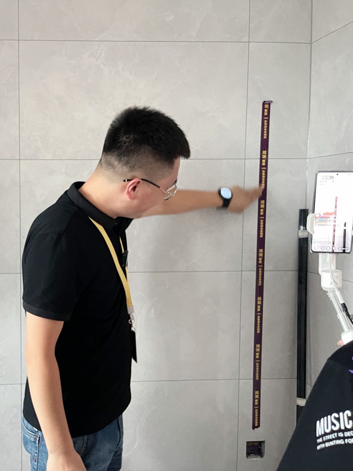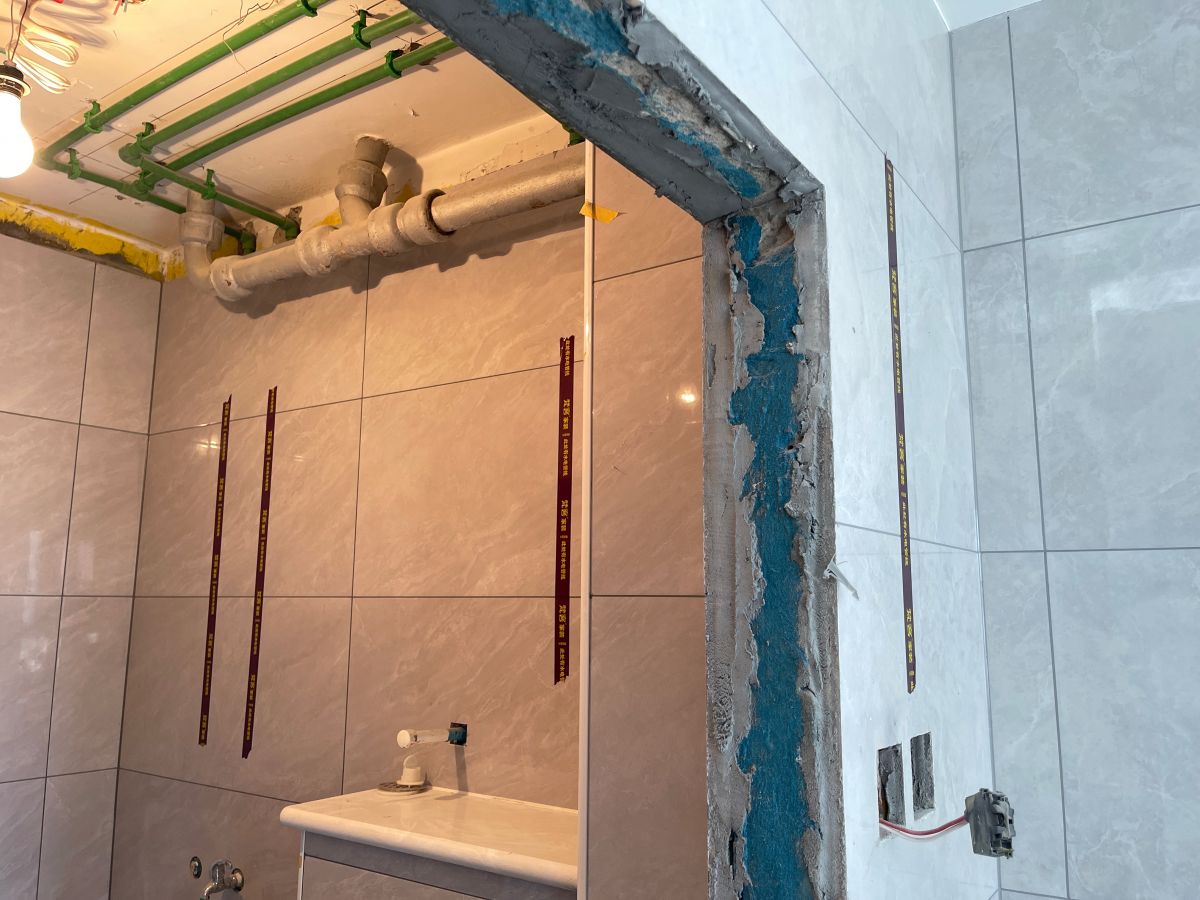 ↑ 衛(wèi)生間的工藝,最重要的就是防水,梵客家裝對此有非常嚴(yán)格的驗收標(biāo)準(zhǔn):滿刷1.8米高。如果隔壁空間緊挨墻的是收納柜,衛(wèi)生間防水會刷到頂。