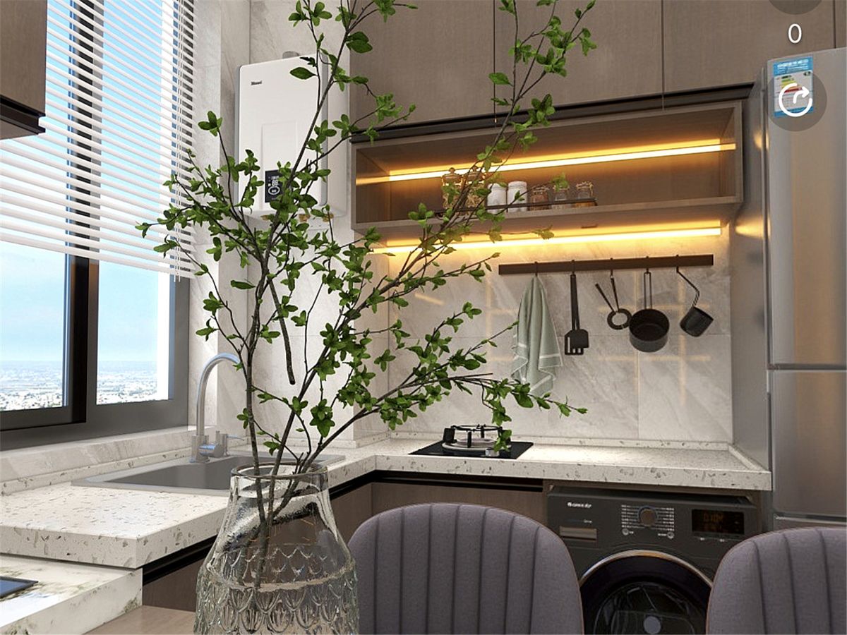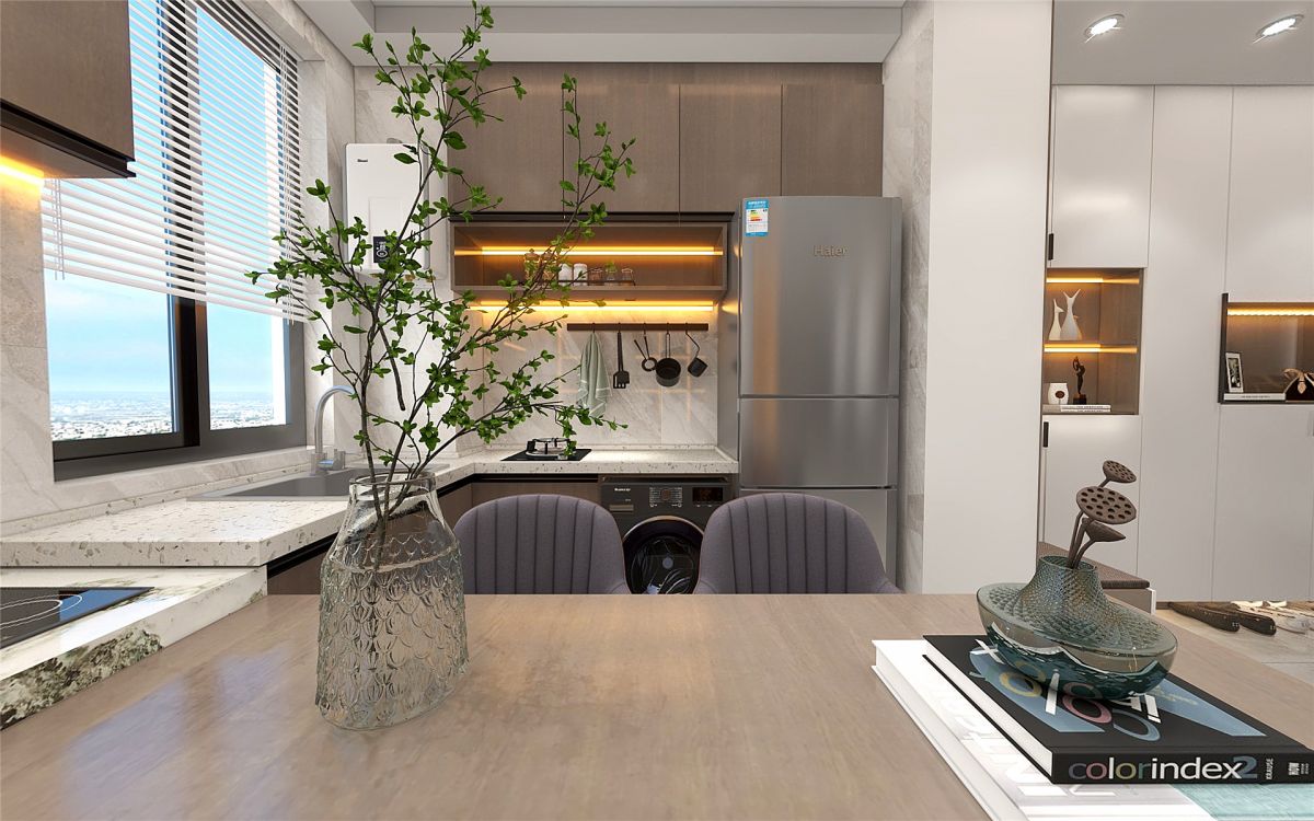 業(yè)主沒有太多復(fù)雜的烹飪需求,設(shè)計師設(shè)計了一個西式廚房,從灶臺→吧臺→書桌一氣呵成,整體又時尚,增加了功能區(qū),提升了空間利用率。