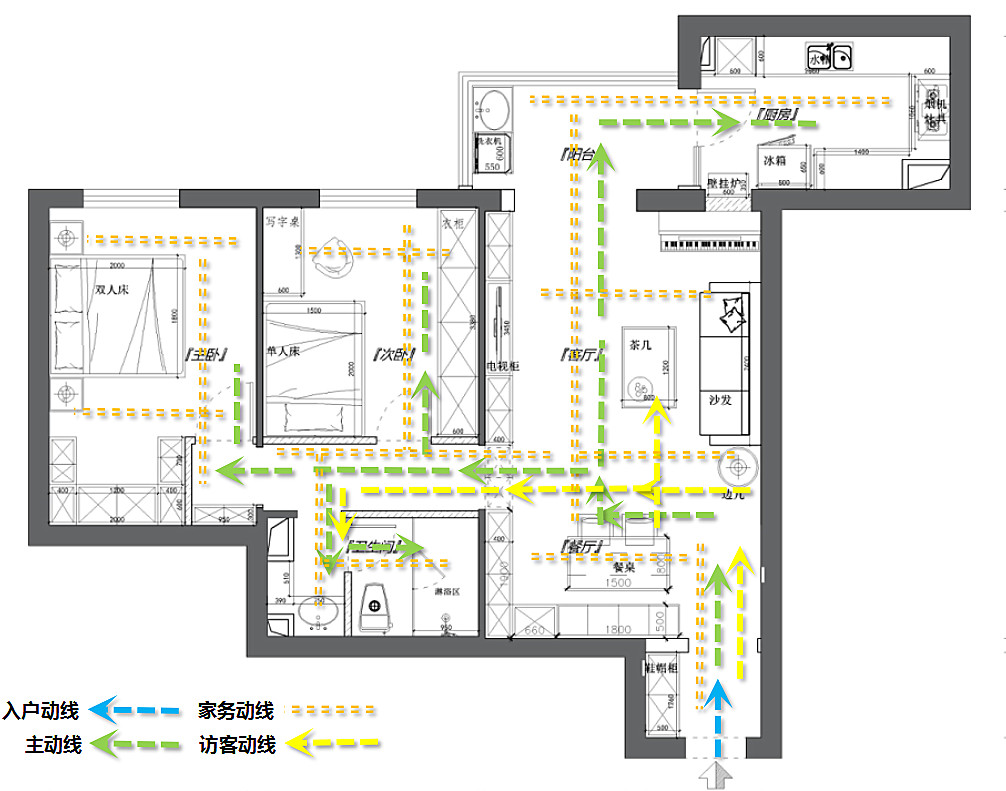 廚房門改動:原結構中,入戶門正對廚房門,視覺不美觀,進入廚房的動線單一且被固定,客廳布局受限,沙發和電視的位置被迫固定。而且廚房采光受限,客廳陽臺管線交錯,利用率低,變成了雜物陽臺,也影響了廚房窗戶的使用。通過改變廚房門的開啟位置,增加了廚房空間的功能性和利用率,動線的調整,使沙發和電視的擺放更加合理,并極大地豐富了客餐廳的收納功能,客廳陽臺也得到了更好的利用。